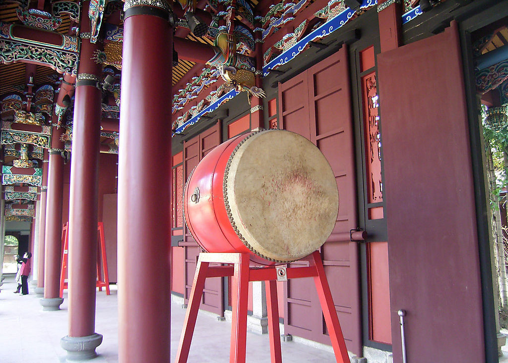 鼓声易与生命磁场产生共鸣,《慈恩天下》富贵园中大鼓,上面写着:福、禄、寿等字,可以激活生命磁场中的福、禄、寿等的信息,并向生命磁场中注入富贵的信息。
